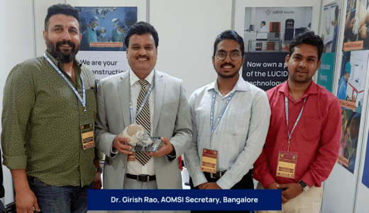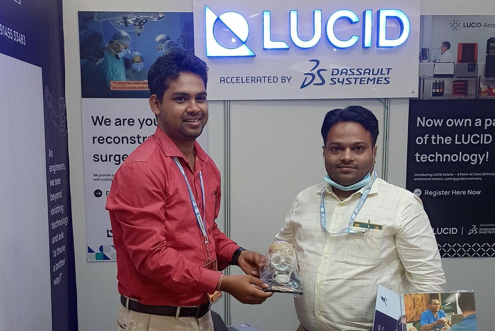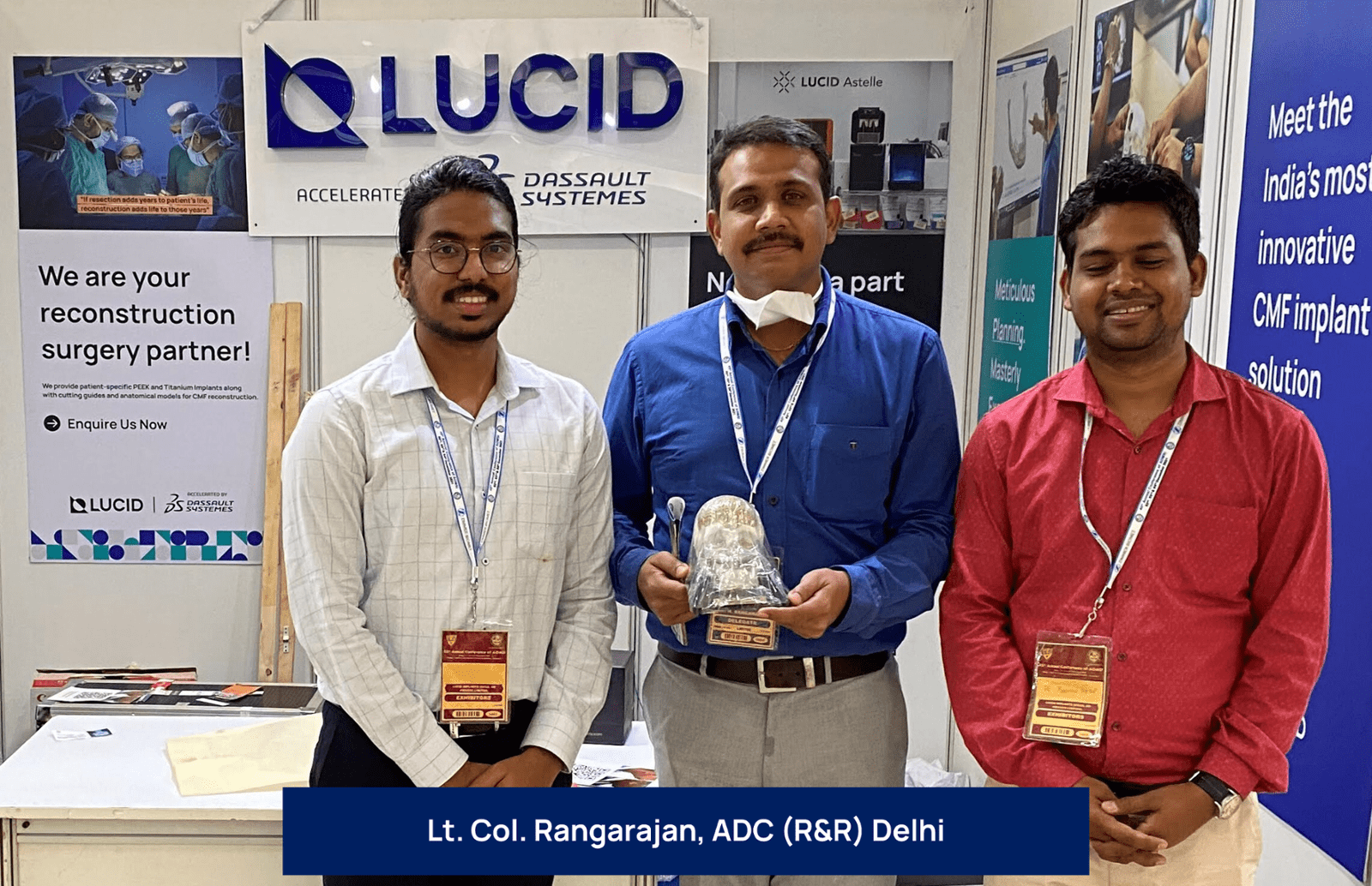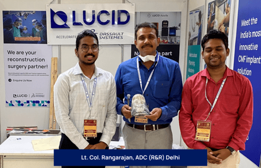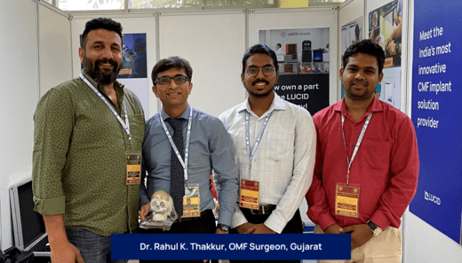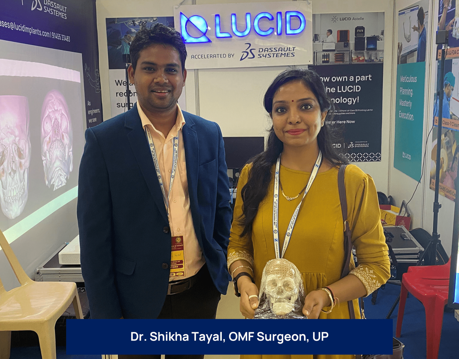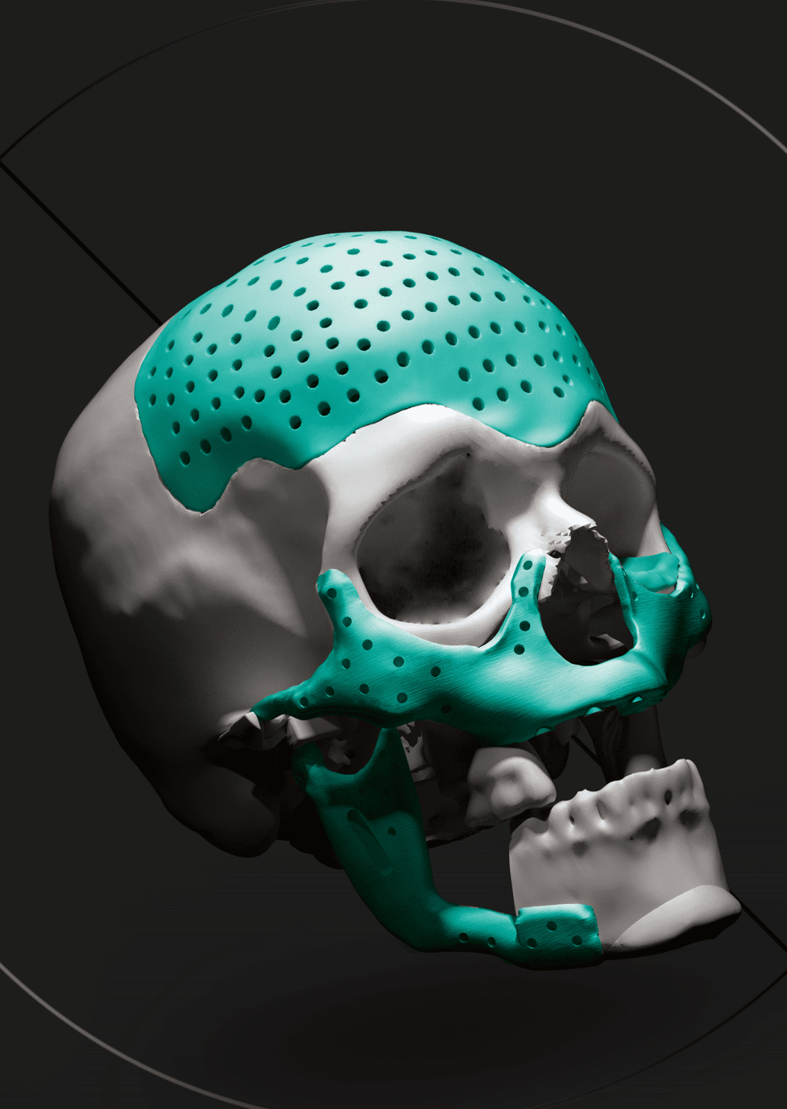 The model is a 70% human-scaled model of the full skull with cranial plate, orbit floor implant, sub periosteal implant, chin implant, and fossa prosthesis, and a mandible implant. The model comes with a sturdy and premium-looking acrylic base plate.